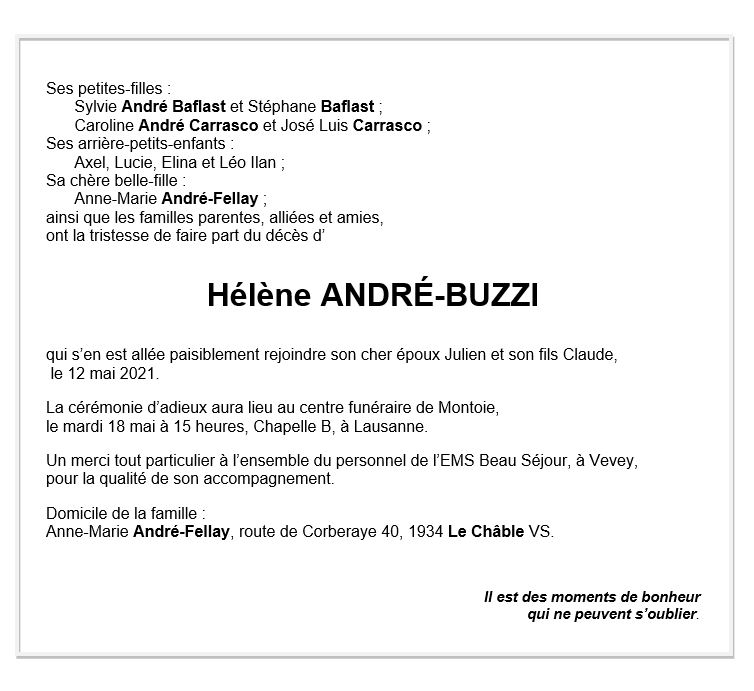 Hélène ANDRÉ-BUZZI 09 fév. 1928 - 12 mai. 2021 Avis mortuaire PFG Télecharger PDF Partager sur: Galerie PreviousNext PreviousNext