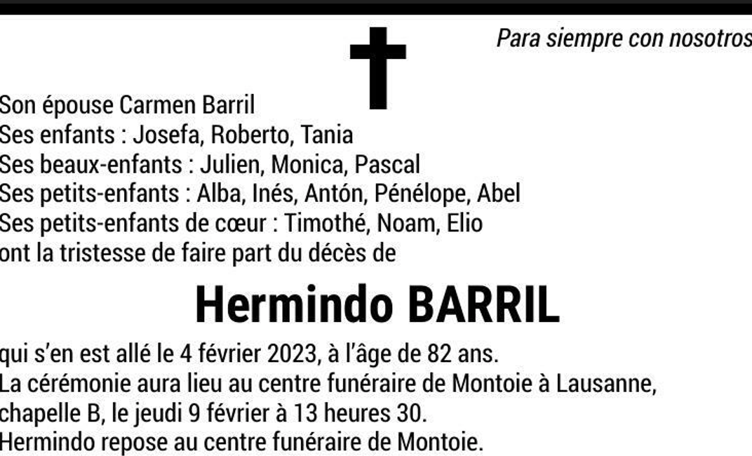 Hermindo BARRIL 03 aoû. 1940 - 04 fév. 2023 Avis mortuaire PFG Télecharger PDF Partager sur: Galerie PreviousNext PreviousNext