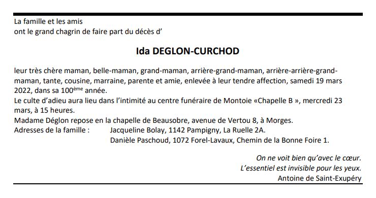 Ida DEGLON-CURCHOD 10 sep. 1922 - 19 mar. 2022 Avis mortuaire PFG Télecharger PDF Partager sur: Galerie PreviousNext PreviousNext