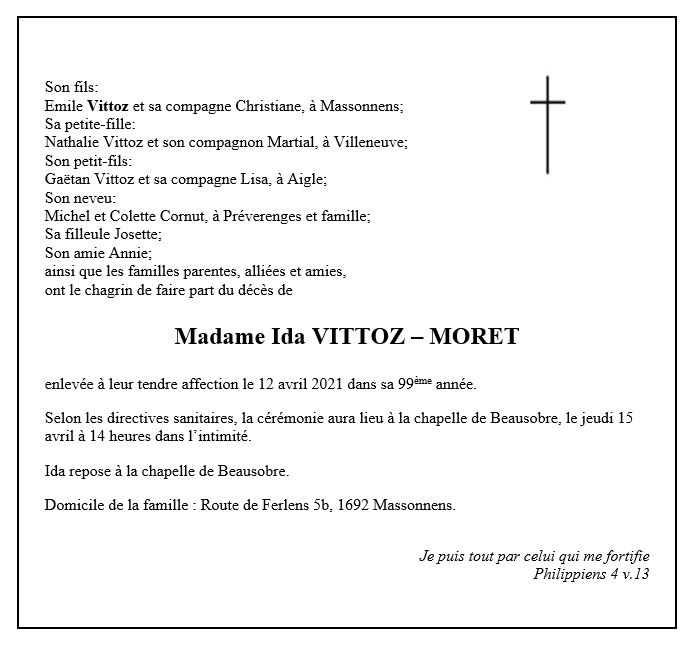 Ida VITTOZ-MORET 29 oct. 1922 - 12 avr. 2021 Avis mortuaire PFG Télecharger PDF Partager sur: Galerie PreviousNext PreviousNext