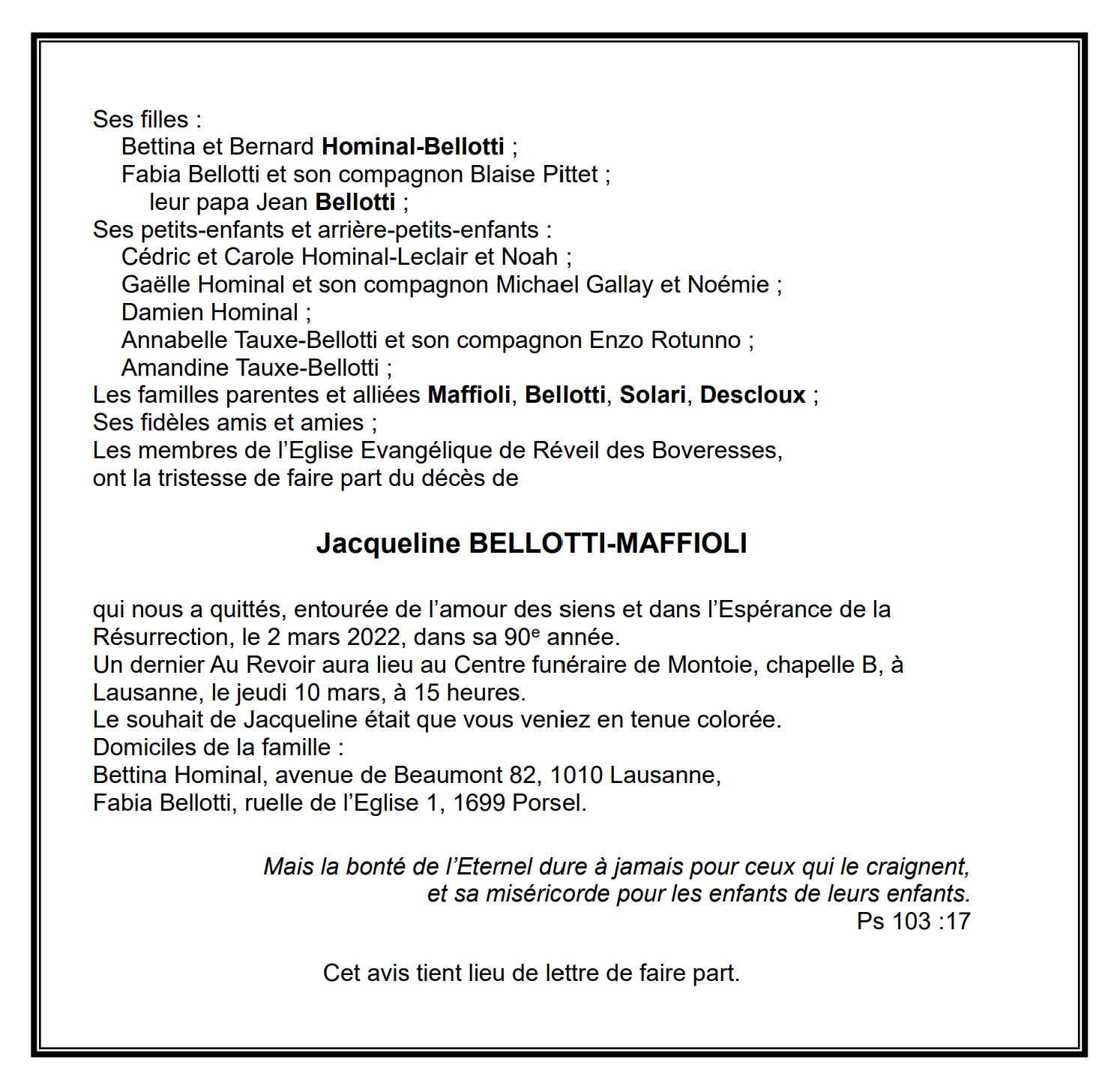 Jacqueline BELLOTTI-MAFFIOLI 10 oct. 1932 - 02 mar. 2022 Avis mortuaire PFG Télecharger PDF Partager sur: Galerie PreviousNext PreviousNext