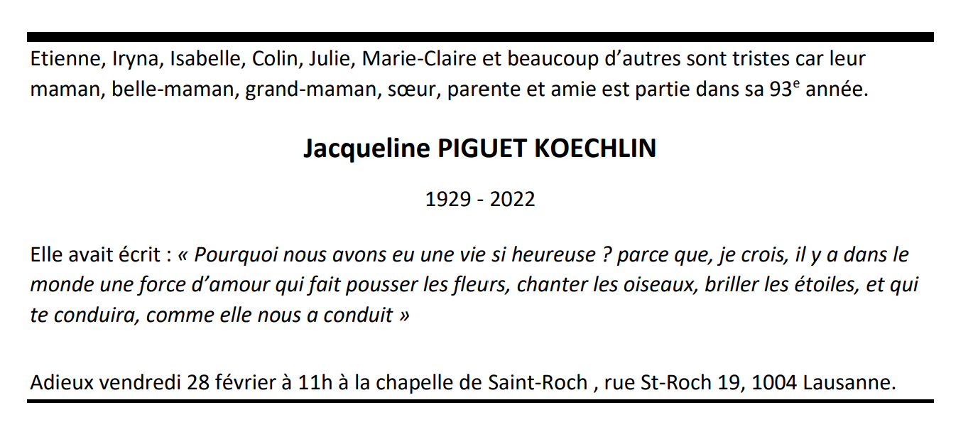 Jacqueline PIGUET KOECHLIN 04 fév. 1929 - 22 jan. 2022 Avis mortuaire PFG Télecharger PDF Partager sur: Galerie PreviousNext PreviousNext