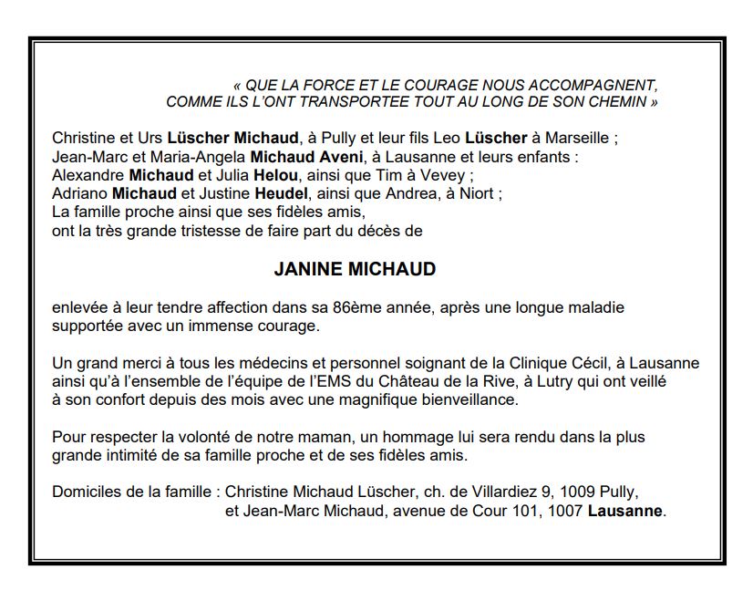JANINE MICHAUD 24 mai. 1937 - 07 oct. 2022 Avis mortuaire PFG Télecharger PDF Partager sur: Galerie PreviousNext PreviousNext