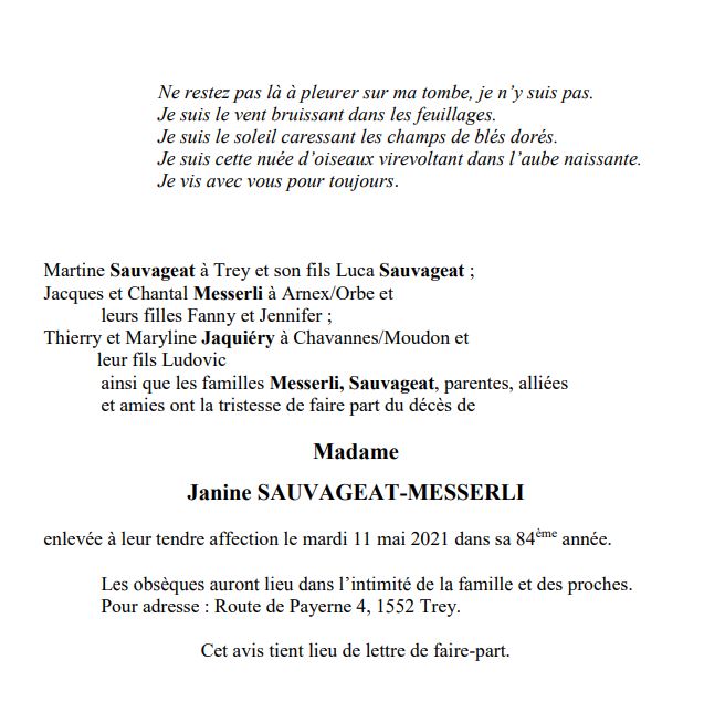 Janine SAUVAGEAT-MESSERLI 26 juin. 1937 - 11 mai. 2021 Avis mortuaire PFG Télecharger PDF Partager sur: Galerie PreviousNext PreviousNext