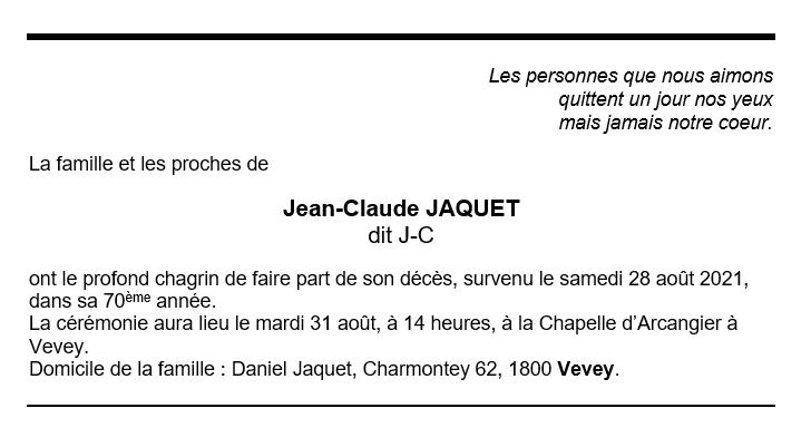 Jean-Claude JAQUET 01 oct. 1951 - 28 aoû. 2021 Avis mortuaire PFG Télecharger PDF Partager sur: Galerie PreviousNext PreviousNext