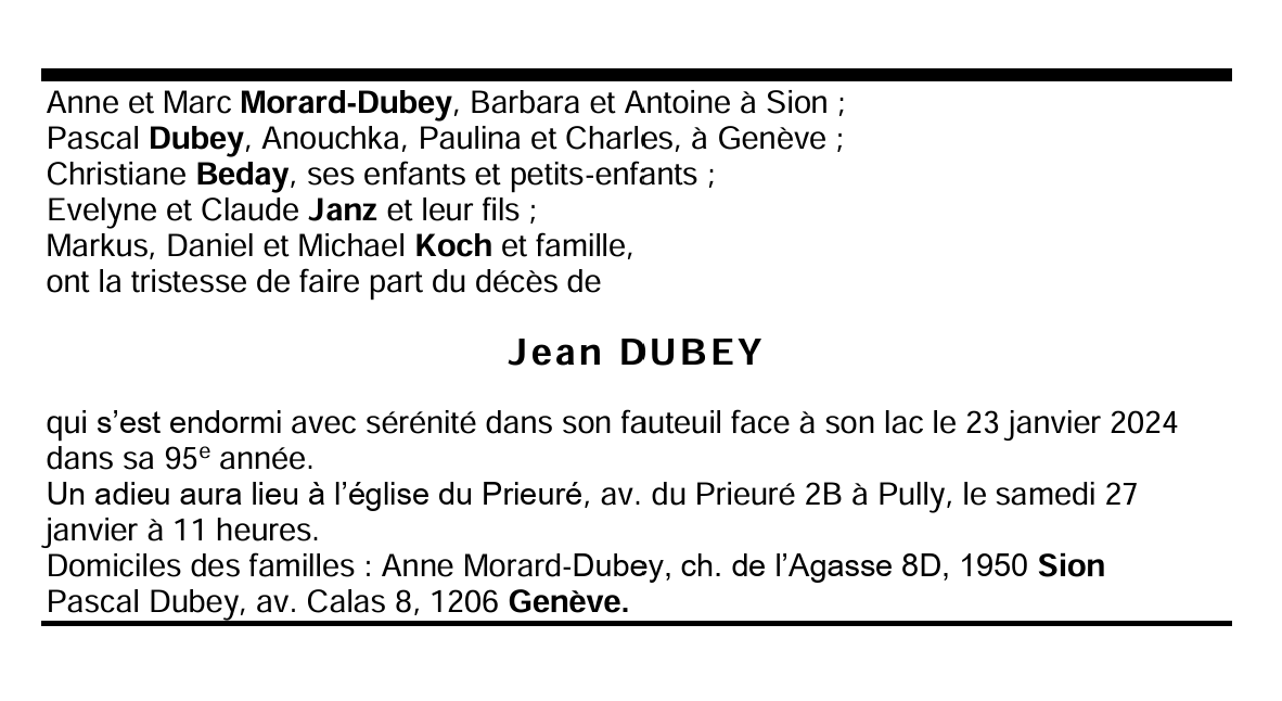 Jean DUBEY 05 sep. 1929 - 23 jan. 2024 Avis mortuaire PFG Télecharger PDF Partager sur: Galerie PreviousNext PreviousNext