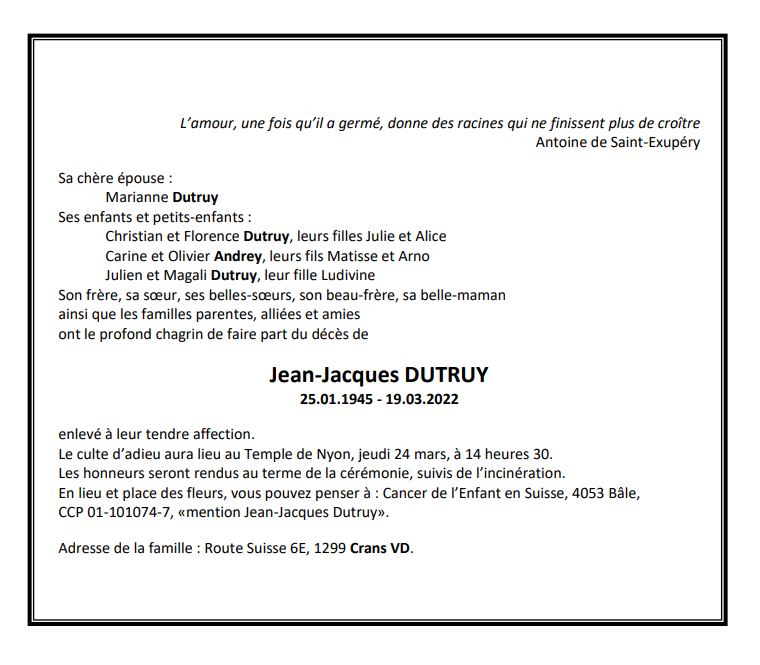 Jean-Jacques DUTRUY 25 jan. 1945 - 19 mar. 2022 Avis mortuaire PFG Télecharger PDF Partager sur: Galerie PreviousNext PreviousNext