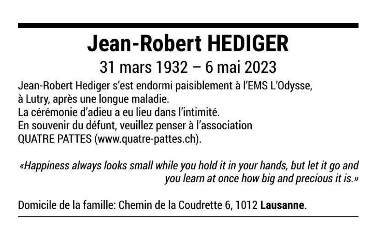 Jean-Robert HEDIGER 31 mar. 1932 - 06 mai. 2023 Avis mortuaire PFG Télecharger PDF Partager sur: Galerie PreviousNext PreviousNext