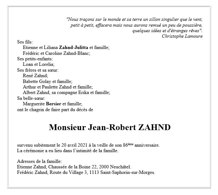 Jean-Robert ZAHND 23 avr. 1935 - 20 avr. 2021 Avis mortuaire PFG Télecharger PDF Partager sur: Galerie PreviousNext PreviousNext