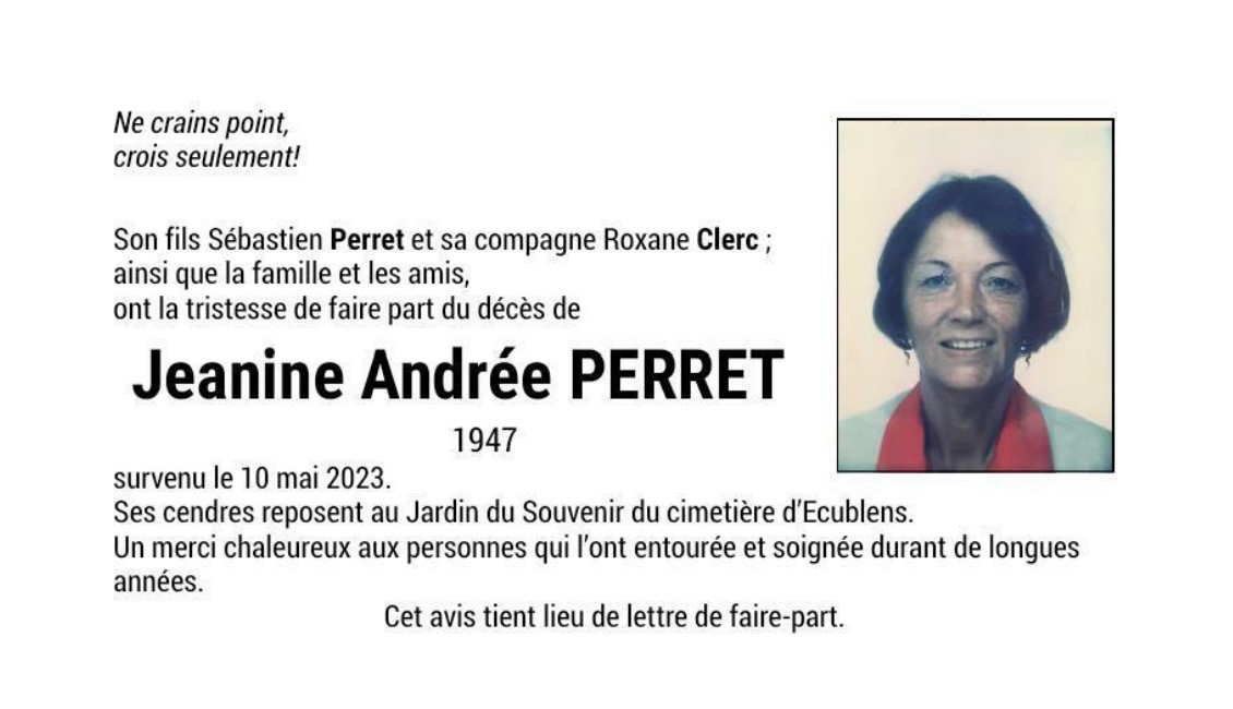 Jeanine Andrée PERRET 28 jan. 1947 - 10 mai. 2023 Avis mortuaire PFG Télecharger PDF Partager sur: Galerie PreviousNext PreviousNext