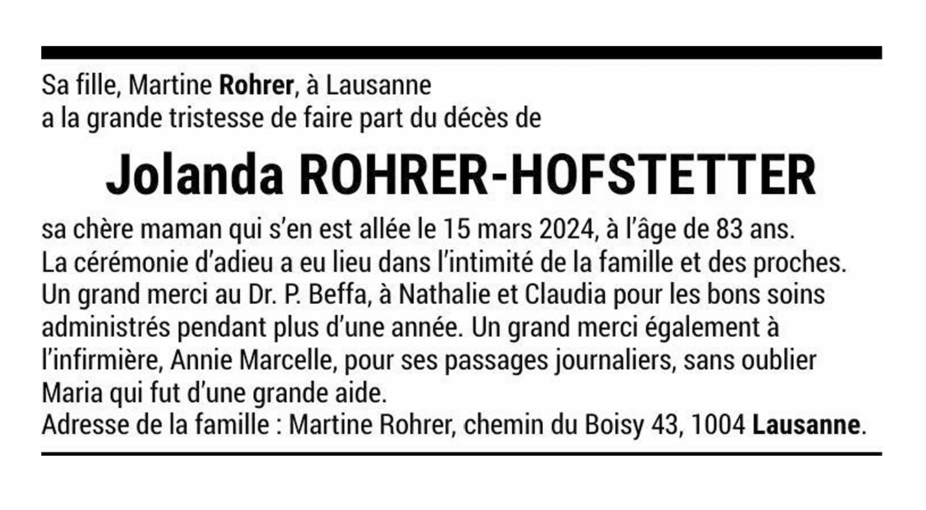 Jolanda ROHRER-HOFSTETTER 20 sep. 1940 - 15 mar. 2024 Avis mortuaire PFG Télecharger PDF Partager sur: Galerie PreviousNext PreviousNext