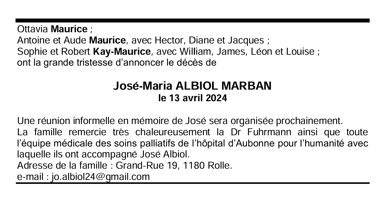 José-Maria ALBIOL MARBAN 08 avr. 1956 - 13 avr. 2024 Avis mortuaire PFG Télecharger PDF Partager sur: Galerie