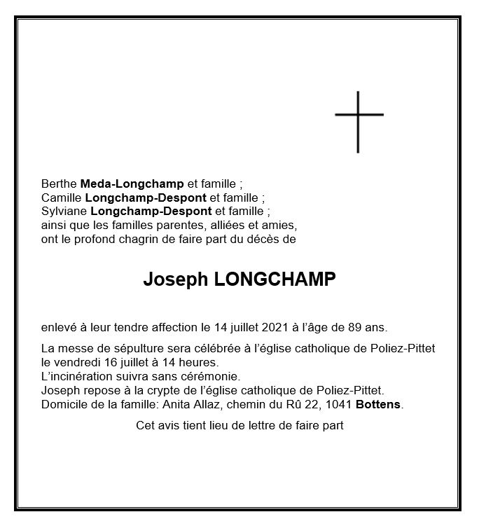 Joseph LONGCHAMP 07 déc. 1932 - 14 juil. 2021 Avis mortuaire PFG Télecharger PDF Partager sur: Galerie PreviousNext PreviousNext