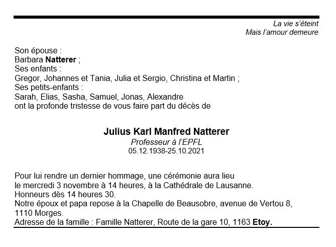 Julius Karl Manfred Natterer 05 déc. 1938 - 25 oct. 2021 Avis mortuaire PFG Télecharger PDF Partager sur: Galerie PreviousNext PreviousNext