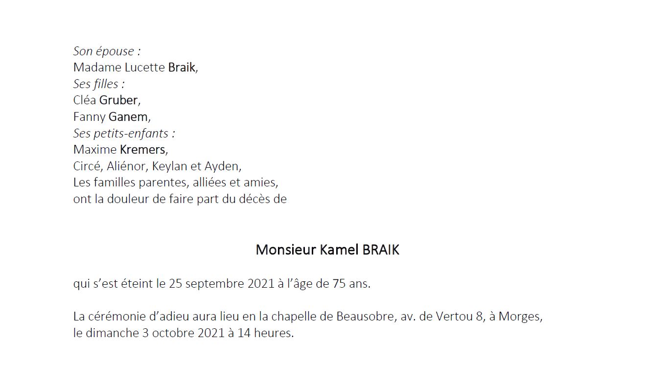 Kamel BRAIK 15 mar. 1946 - 25 sep. 2021 Avis mortuaire PFG Télecharger PDF Partager sur: Galerie PreviousNext PreviousNext