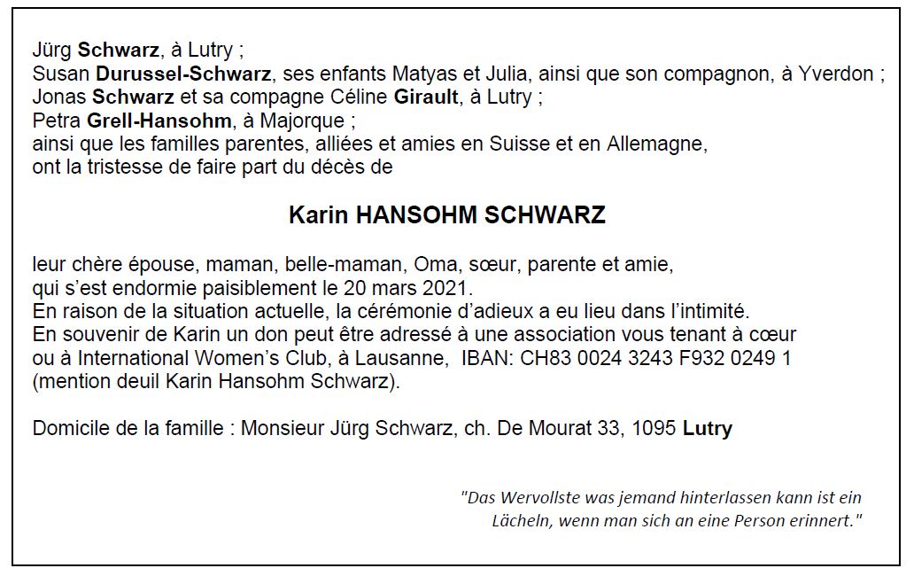 Karin HANSOHM SCHWARZ 19 avr. 1942 - 20 mar. 2021 Avis mortuaire PFG Télecharger PDF Partager sur: Galerie PreviousNext PreviousNext