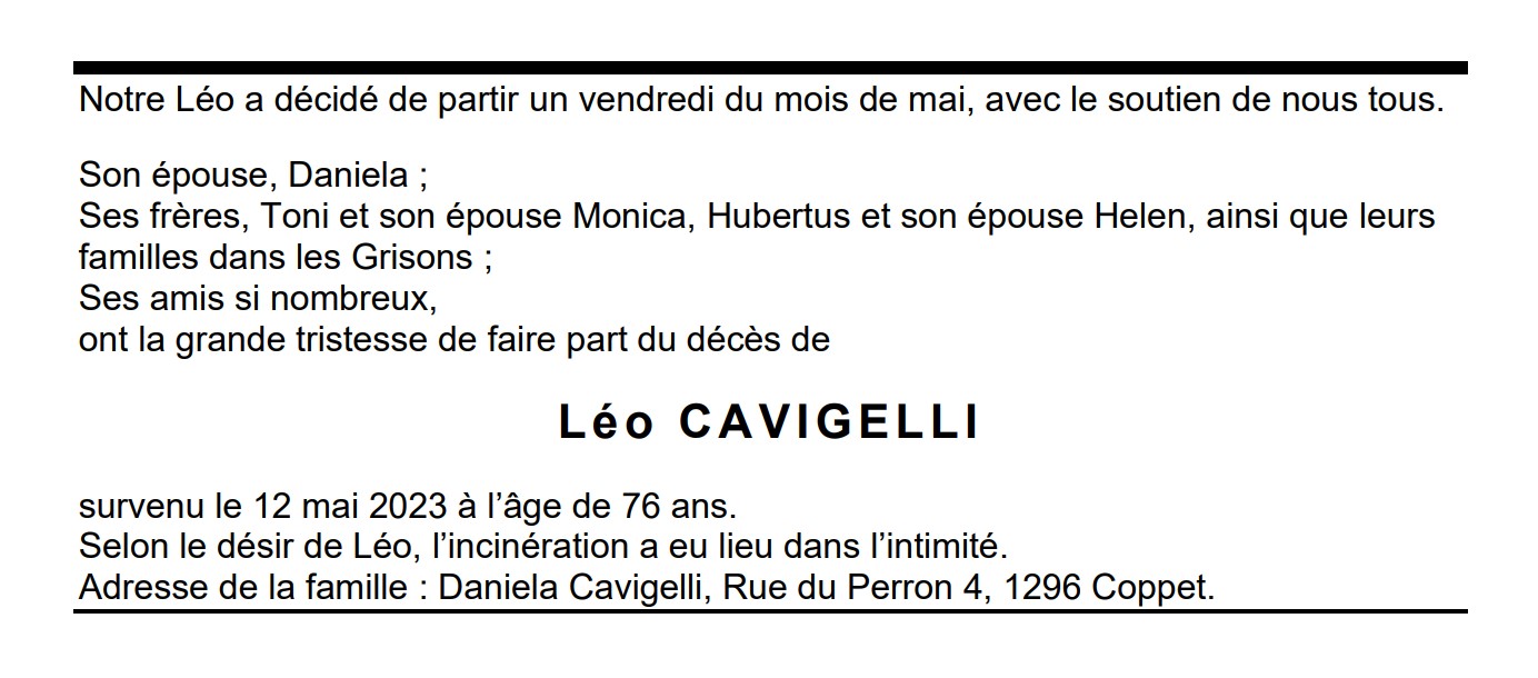 Léo CAVIGELLI 07 juil. 1946 - 12 mai. 2023 Avis mortuaire PFG Télecharger PDF Partager sur: Galerie PreviousNext PreviousNext
