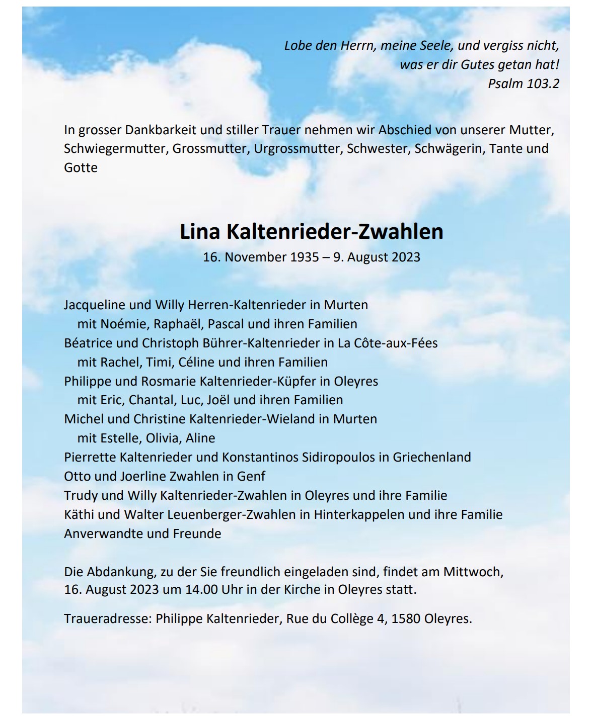 Lina Kaltenrieder-Zwahlen 16 nov. 1935 - 09 aoû. 2023 Avis mortuaire PFG Télecharger PDF Partager sur: Galerie