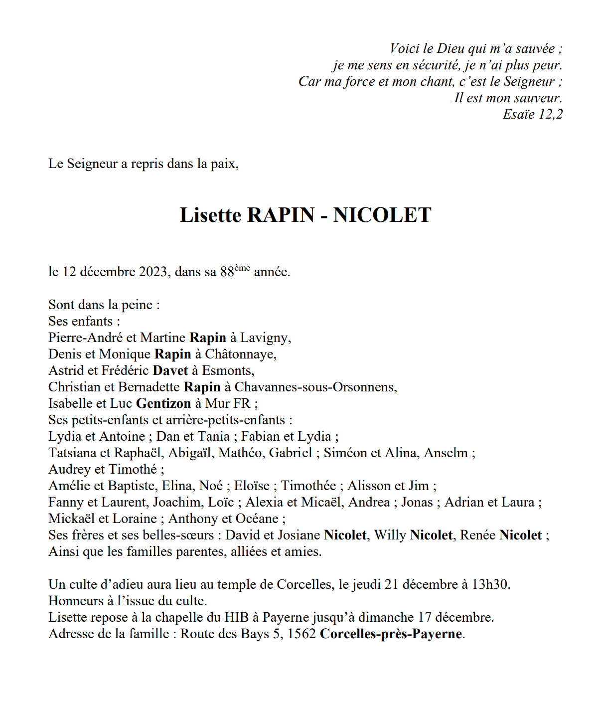Lisette RAPIN - NICOLET 19 avr. 1936 - 12 déc. 2023 Avis mortuaire PFG Télecharger PDF Partager sur: Galerie PreviousNext PreviousNext