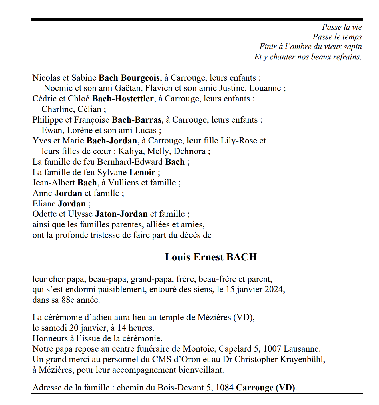 Louis Ernest BACH 22 mar. 1936 - 15 jan. 2024 Avis mortuaire PFG Télecharger PDF Partager sur: Galerie PreviousNext PreviousNext