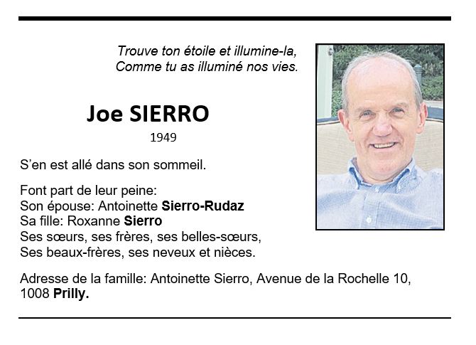 Louis Joseph SIERRO 29 mar. 1949 - 23 mai. 2021 Avis mortuaire PFG Télecharger PDF Partager sur: Galerie PreviousNext PreviousNext