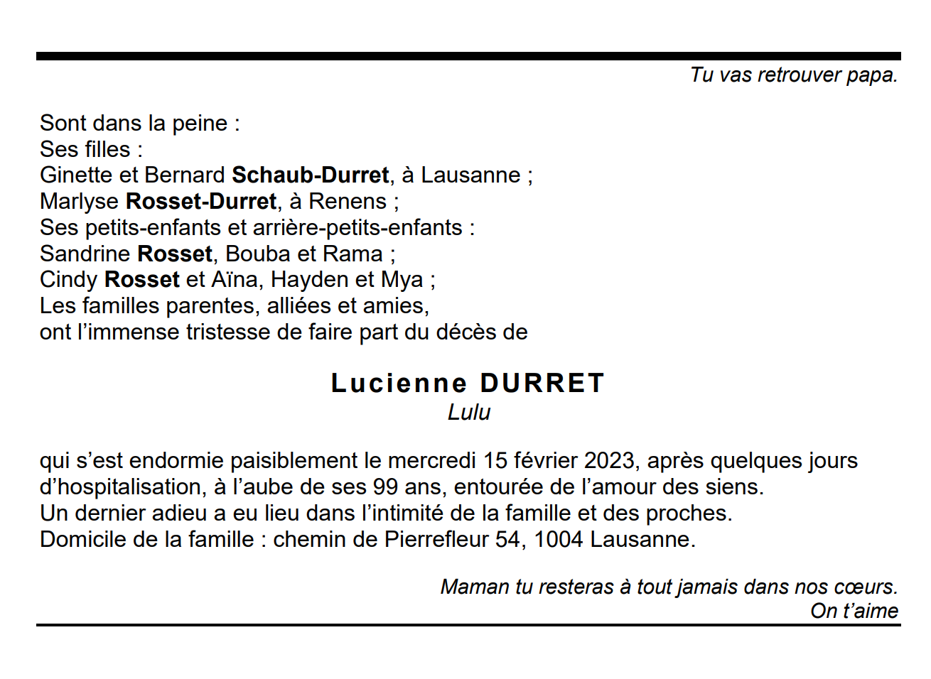 Lucienne DURRET 24 mar. 1924 - 15 fév. 2023 Avis mortuaire PFG Télecharger PDF Partager sur: Galerie PreviousNext PreviousNext