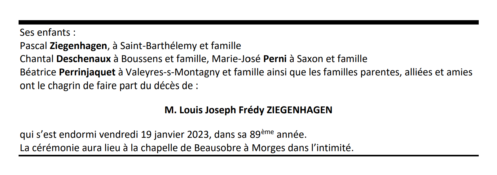 M. Louis Joseph Frédy ZIEGENHAGEN 16 oct. 1934 - 19 jan. 2023 Avis mortuaire PFG Télecharger PDF Partager sur: Galerie PreviousNext PreviousNext