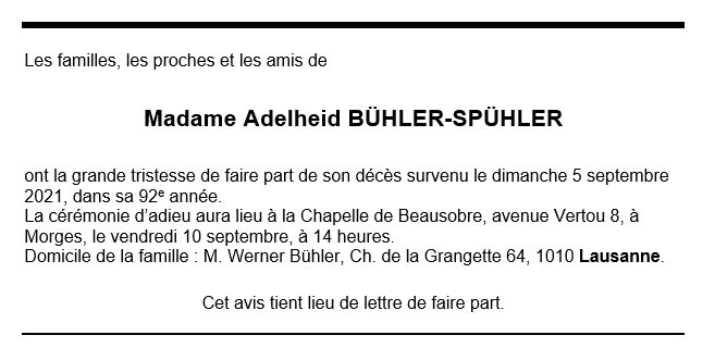 Madame Adelheid BÜHLER-SPÜHLER 18 oct. 1929 - 05 sep. 2021 Avis mortuaire PFG Télecharger PDF Partager sur: Galerie PreviousNext PreviousNext