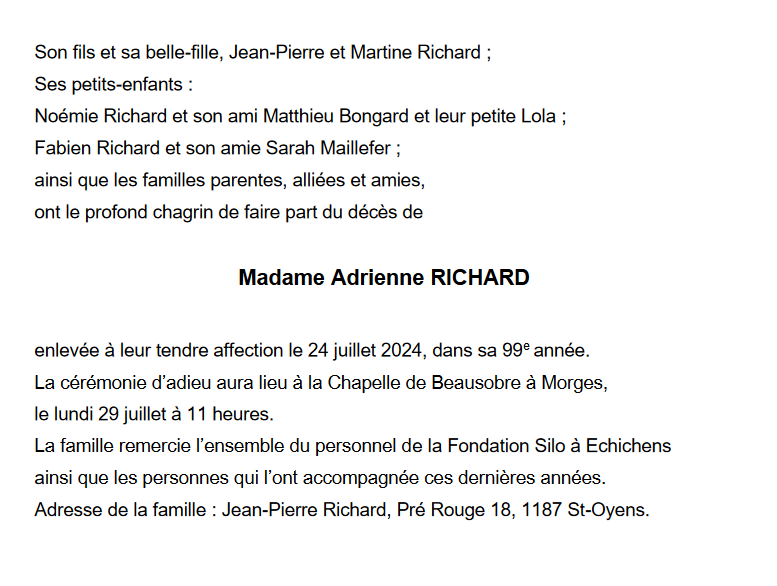 Madame Adrienne RICHARD 19 mai. 1926 - 24 juil. 2024 Avis mortuaire PFG Télecharger PDF Partager sur: Galerie