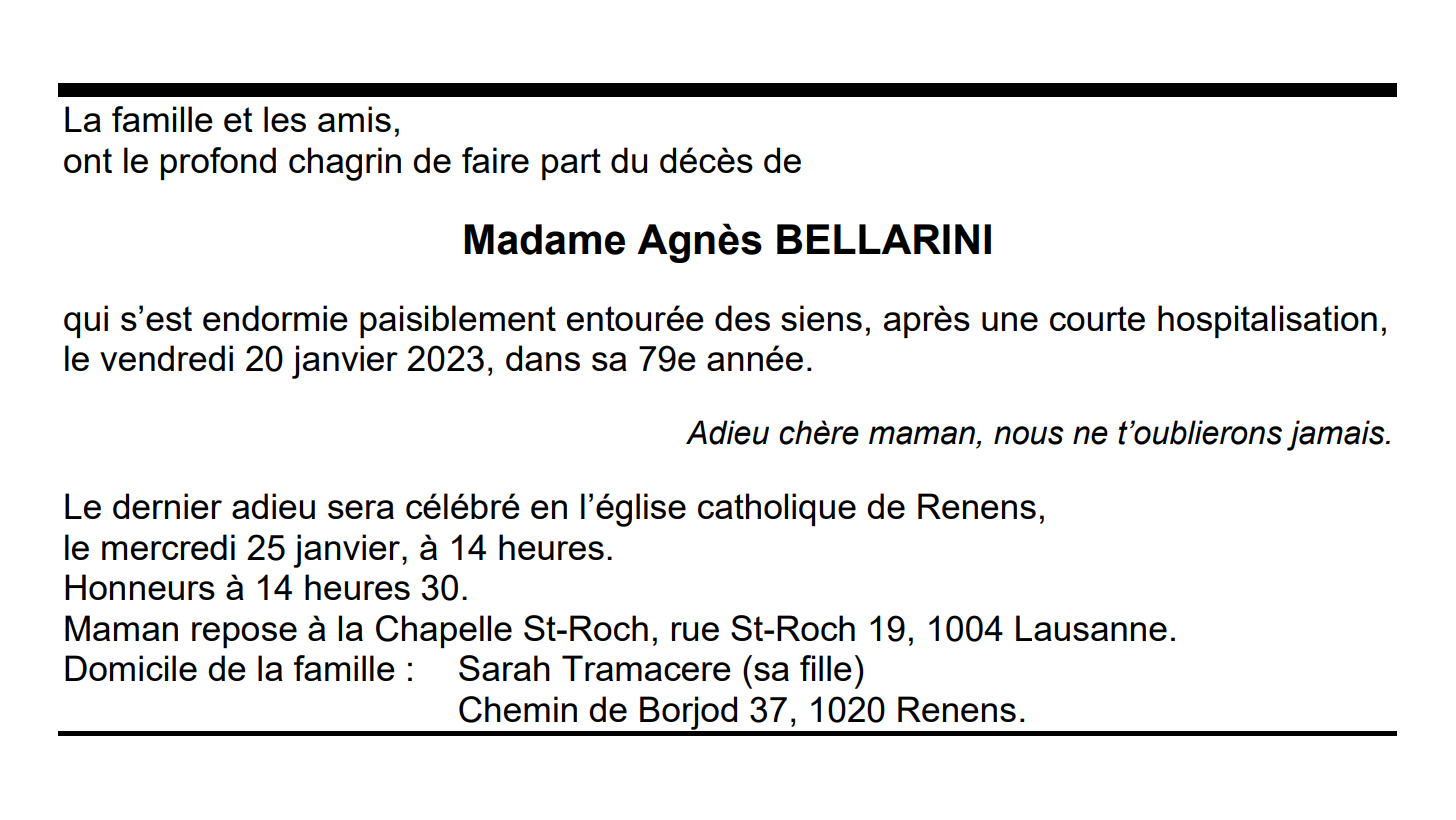 Madame Agnès BELLARINI 14 avr. 1944 - 20 jan. 2023 Avis mortuaire PFG Télecharger PDF Partager sur: Galerie PreviousNext PreviousNext