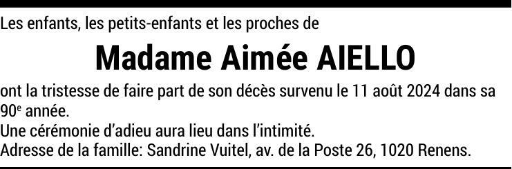 Madame Aimée AIELLO 22 avr. 1935 - 11 aoû. 2024 Avis mortuaire PFG Partager sur: Galerie PreviousNext PreviousNext