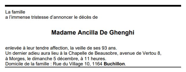 Madame Ancilla De Ghenghi 08 déc. 1928 - 01 déc. 2021 Avis mortuaire PFG Télecharger PDF Partager sur: Galerie PreviousNext PreviousNext