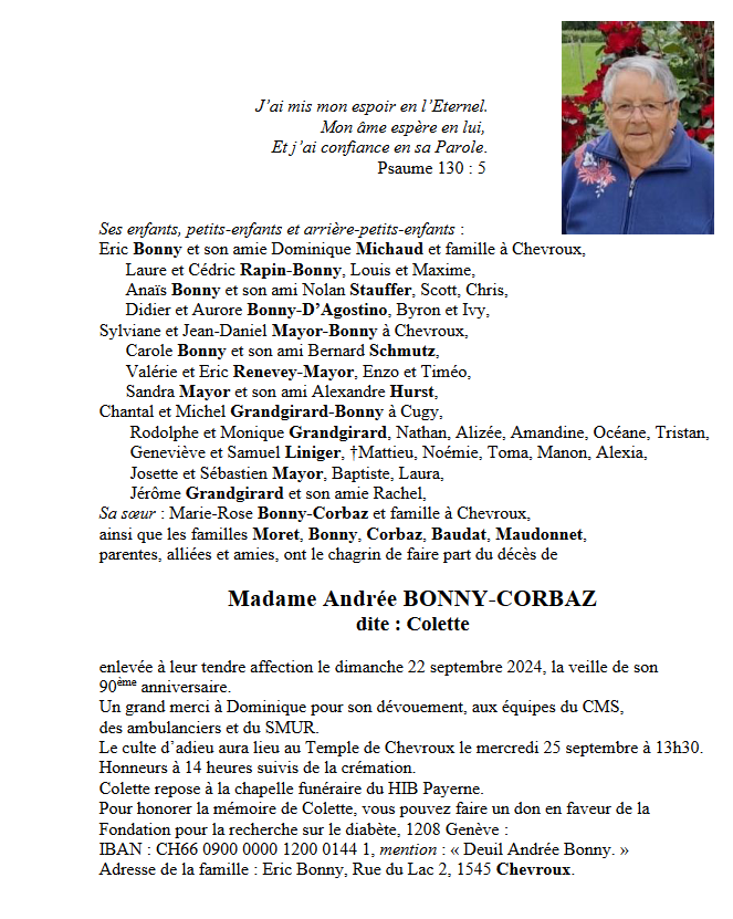 Madame Andrée BONNY-CORBAZ 08 oct. 1934 - 22 sep. 2024 Avis mortuaire PFG Télecharger PDF Partager sur: Galerie