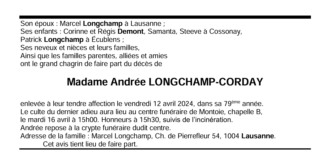 Madame Andrée LONGCHAMP-CORDAY 14 juin. 1945 - 12 avr. 2024 Avis mortuaire PFG Télecharger PDF Partager sur: Galerie PreviousNext PreviousNext