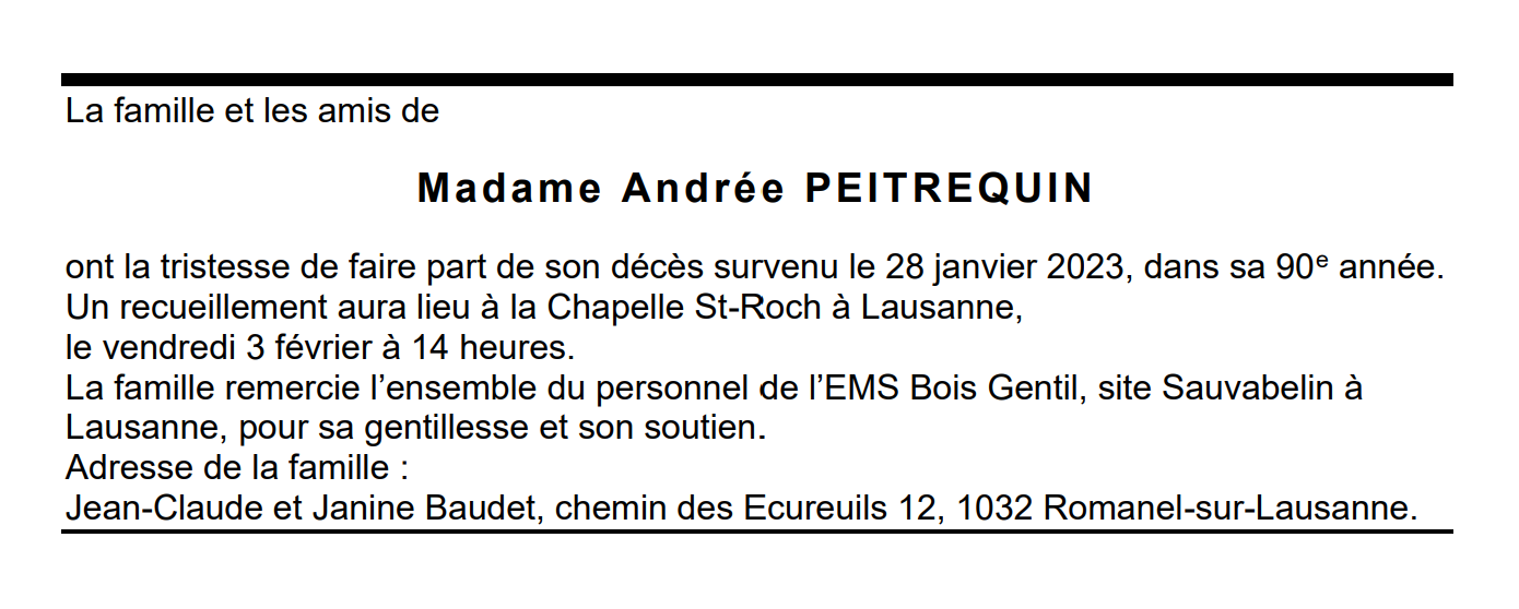 Madame Andrée PEITREQUIN 02 nov. 1932 - 28 jan. 2023 Avis mortuaire PFG Télecharger PDF Partager sur: Galerie PreviousNext PreviousNext
