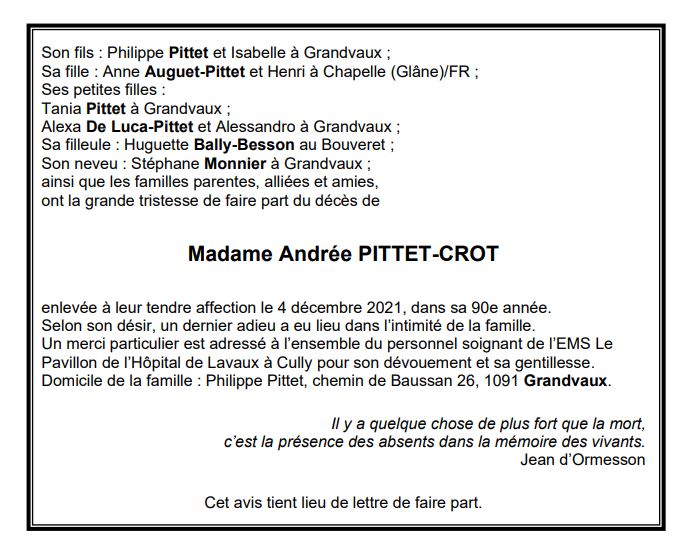 Madame Andrée PITTET-CROT 24 oct. 1932 - 04 déc. 2021 Avis mortuaire PFG Télecharger PDF Partager sur: Galerie