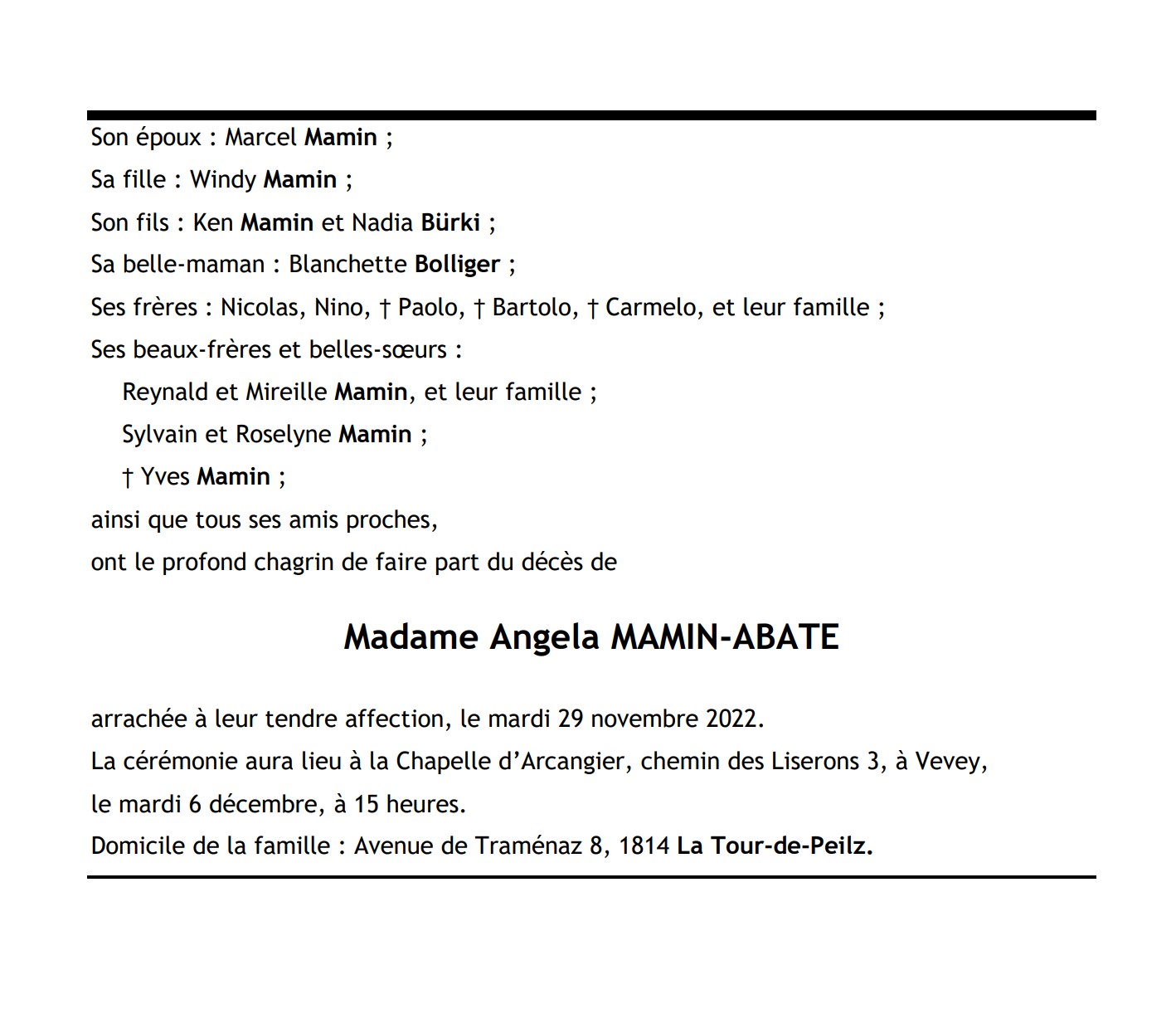 Madame Angela MAMIN-ABATE 05 mai. 1952 - 29 nov. 2022 Avis mortuaire PFG Télecharger PDF Partager sur: Galerie PreviousNext PreviousNext
