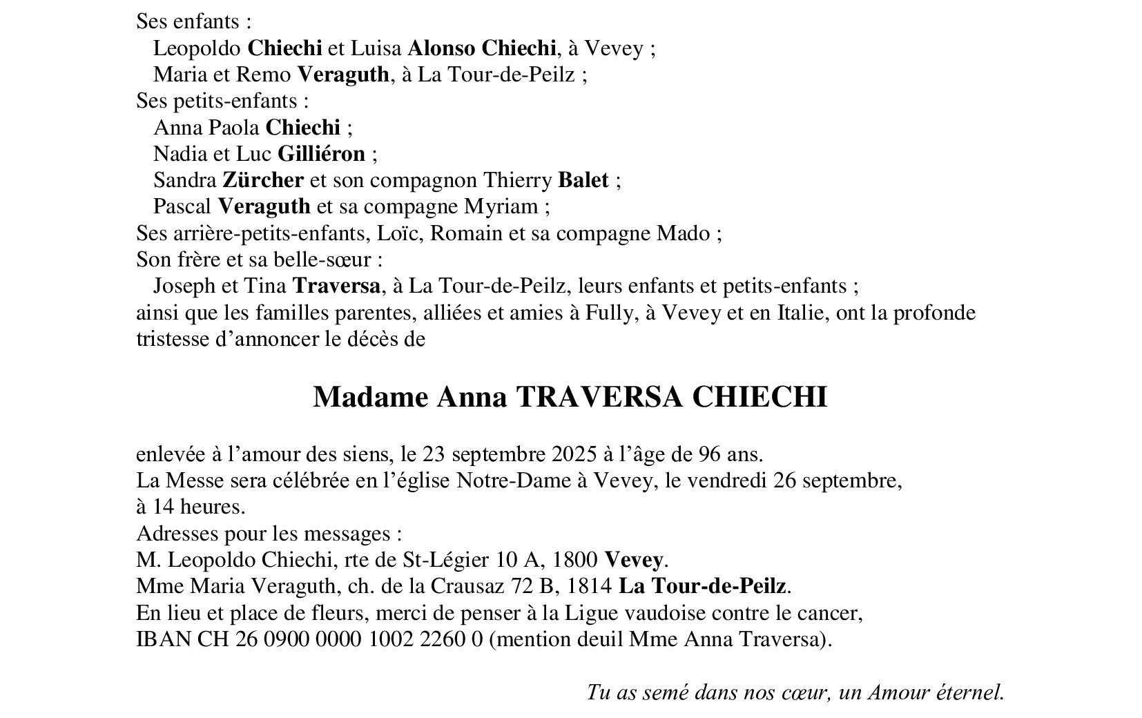 Madame Anna TRAVERSA CHIECHI 15 avr. 1929 - 23 sep. 2025 Avis mortuaire PFG Partager sur: Galerie PreviousNext PreviousNext