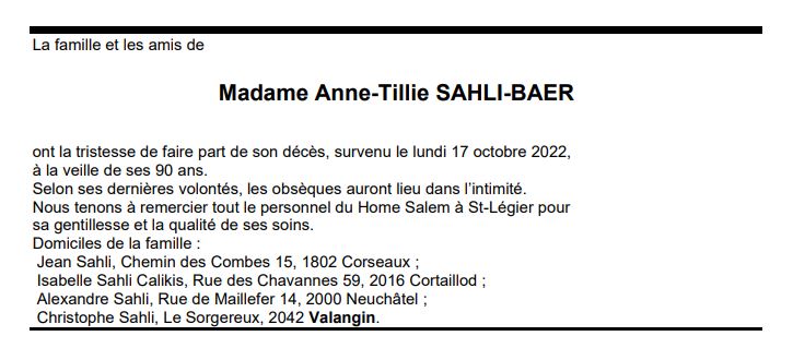 Madame Anne-Tillie SAHLI-BAER 31 oct. 1932 - 17 oct. 2022 Avis mortuaire PFG Télecharger PDF Partager sur: Galerie