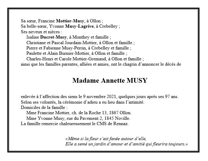 Madame Annette MUSY 02 nov. 1924 - 09 nov. 2021 Avis mortuaire PFG Télecharger PDF Partager sur: Galerie PreviousNext PreviousNext