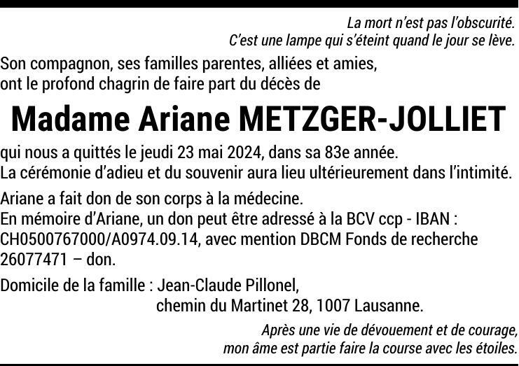 Madame Ariane METZGER 28 jan. 1942 - 23 mai. 2024 Avis mortuaire PFG Télecharger PDF Partager sur: Galerie PreviousNext PreviousNext