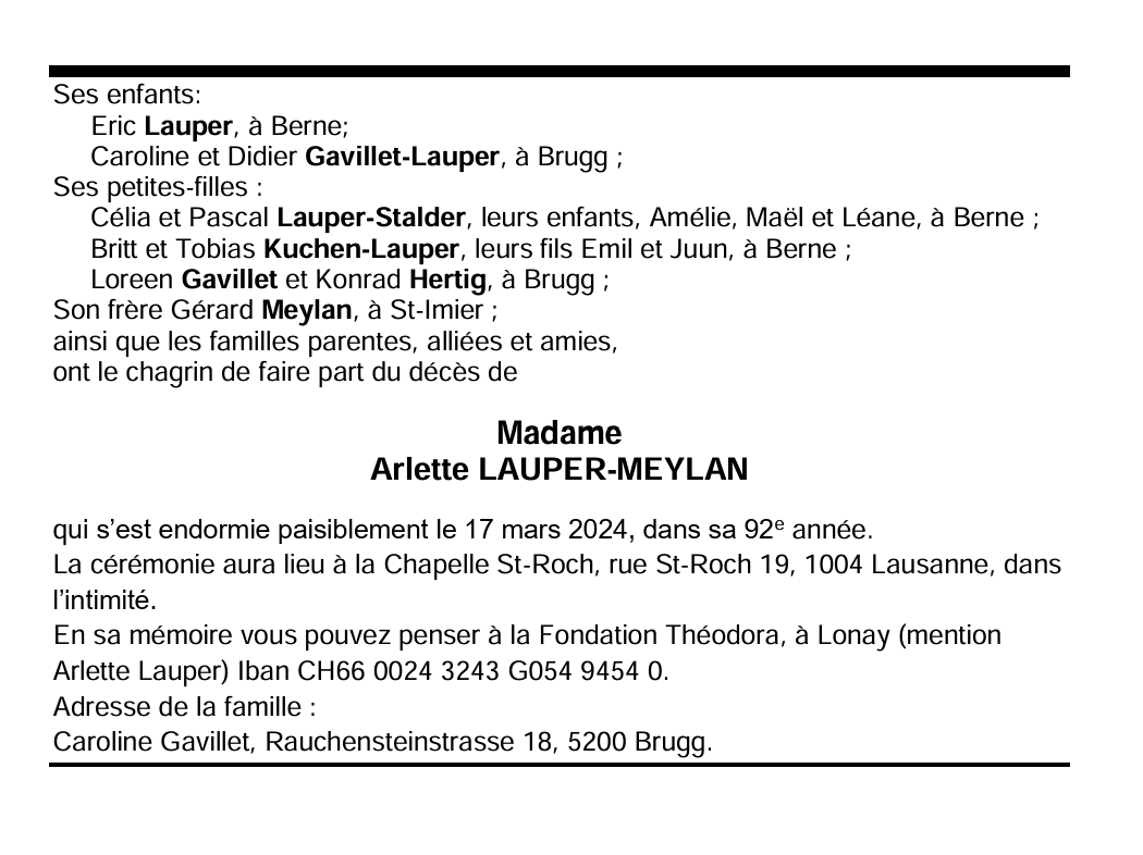 Madame Arlette LAUPER-MEYLAN 31 juil. 1932 - 17 mar. 2024 Avis mortuaire PFG Télecharger PDF Partager sur: Galerie PreviousNext PreviousNext