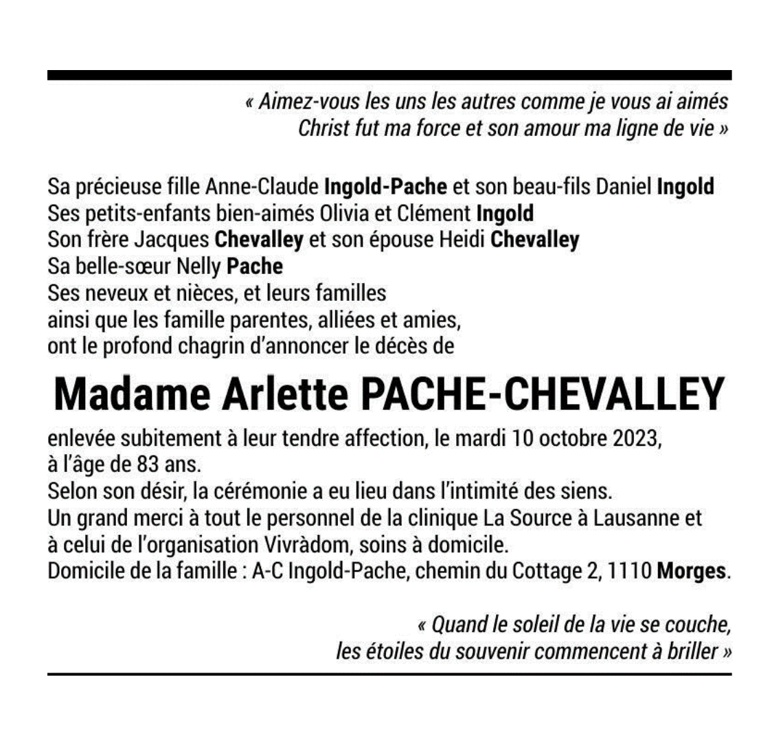 Madame Arlette PACHE-CHEVALLEY 26 fév. 1940 - 10 oct. 2023 Avis mortuaire PFG Télecharger PDF Partager sur: Galerie PreviousNext PreviousNext