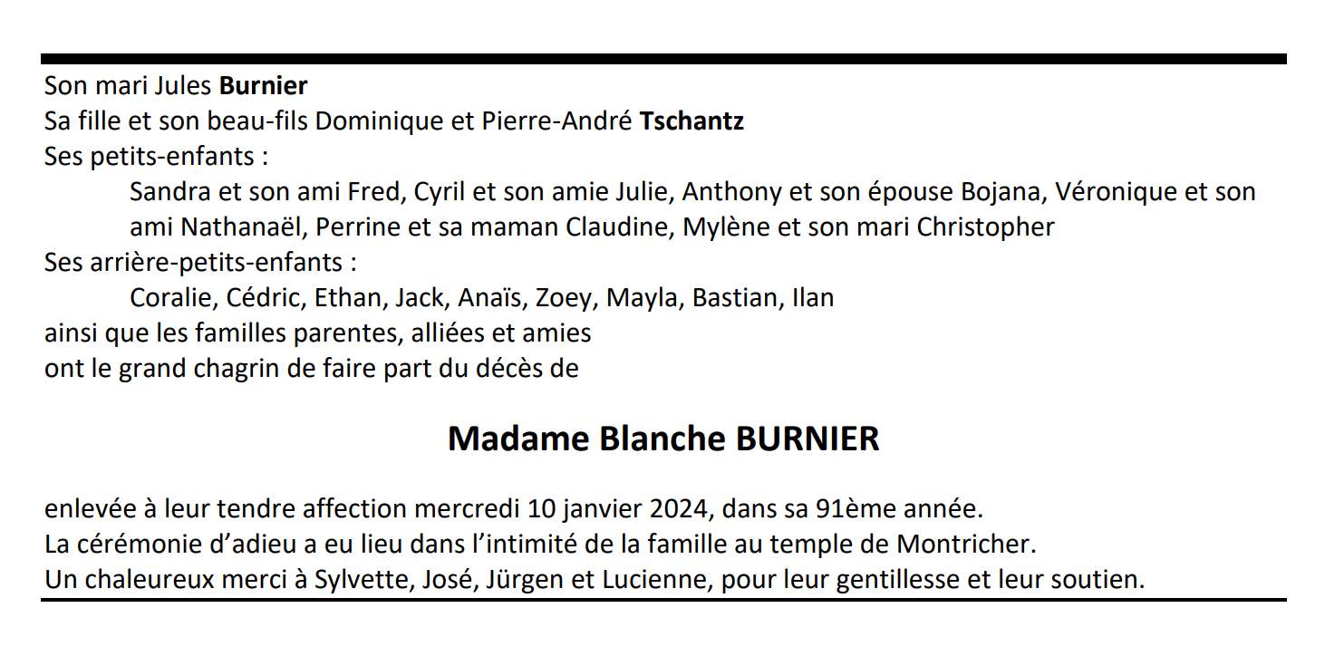 Madame Blanche BURNIER 02 fév. 1933 - 10 jan. 2024 Avis mortuaire PFG Télecharger PDF Partager sur: Galerie PreviousNext PreviousNext