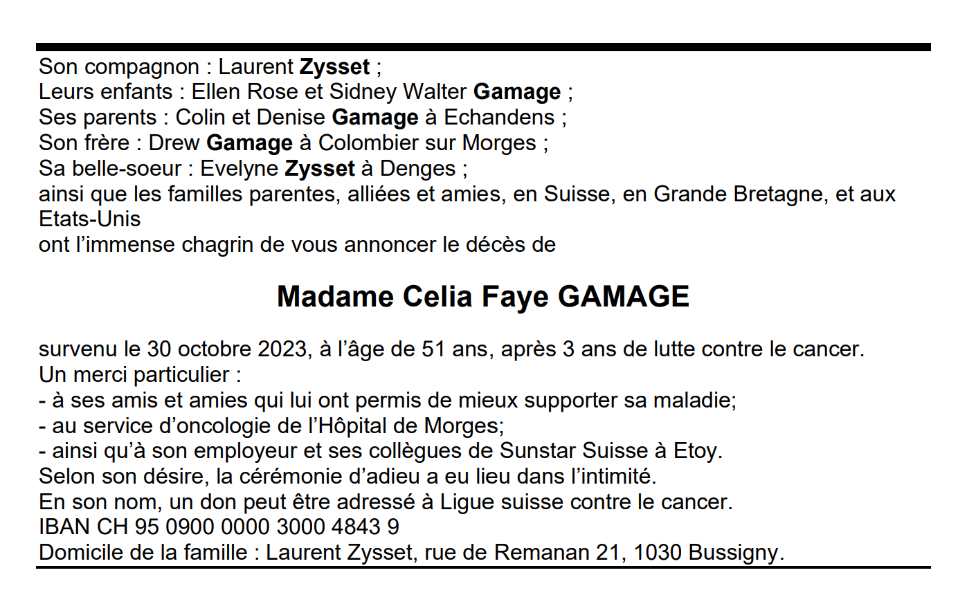 Madame Celia Faye GAMAGE 01 mar. 1972 - 30 oct. 2023 Avis mortuaire PFG Télecharger PDF Partager sur: Galerie PreviousNext PreviousNext