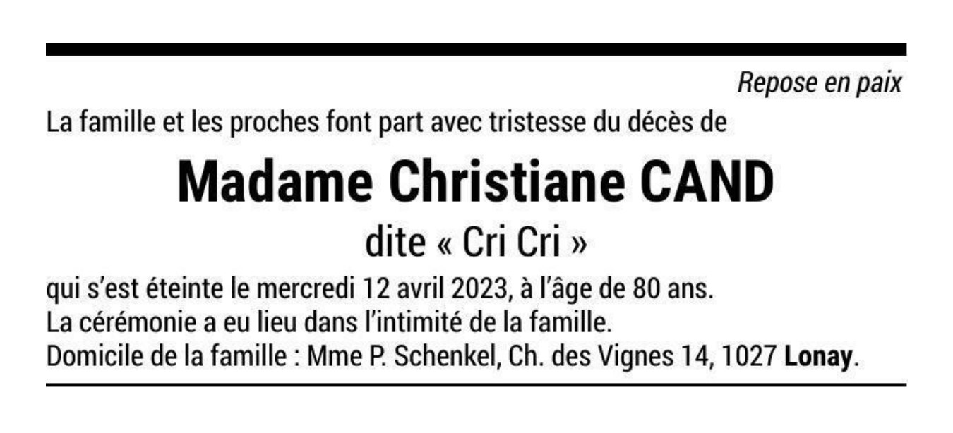 Madame Christiane CAND dite « Cri Cri » 03 mar. 1943 - 12 avr. 2023 Avis mortuaire PFG Télecharger PDF Partager sur: Galerie PreviousNext PreviousNext