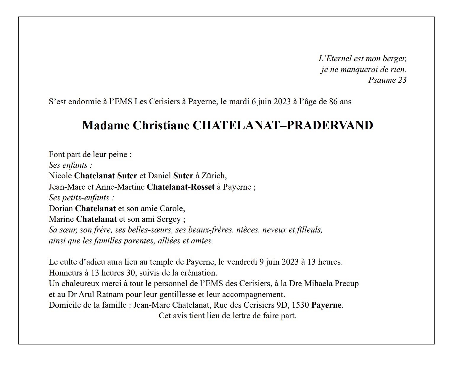Madame Christiane CHATELANAT–PRADERVAND 03 mai. 1937 - 06 juin. 2023 Avis mortuaire PFG Télecharger PDF Partager sur: Galerie PreviousNext PreviousNext