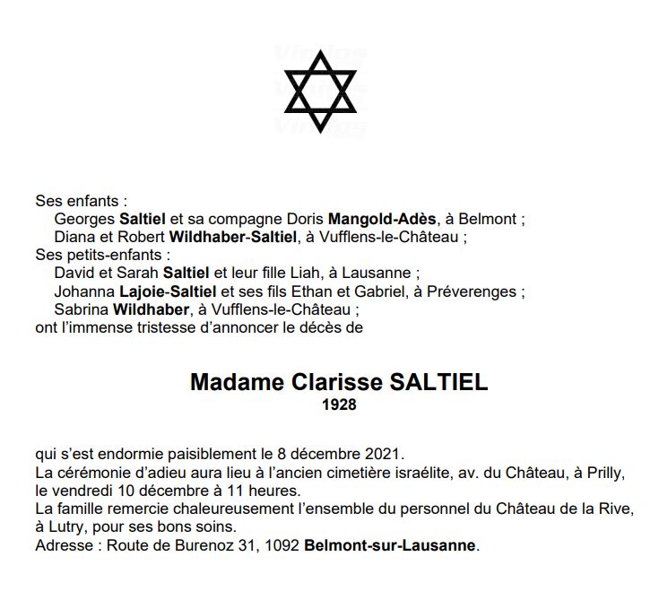 Madame Clarisse SALTIEL 21 oct. 1928 - 08 déc. 2021 Avis mortuaire PFG Télecharger PDF Partager sur: Galerie PreviousNext PreviousNext