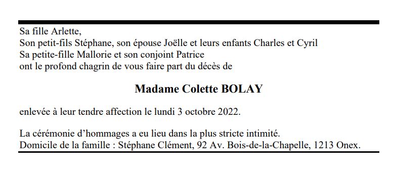 Madame Colette BOLAY 29 juin. 1929 - 03 oct. 2022 Avis mortuaire PFG Télecharger PDF Partager sur: Galerie PreviousNext PreviousNext