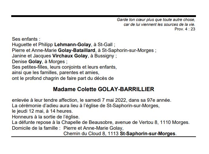 Madame Colette GOLAY-BARRILLIER 05 déc. 1925 - 07 mai. 2022 Avis mortuaire PFG Télecharger PDF Partager sur: Galerie PreviousNext PreviousNext